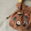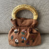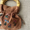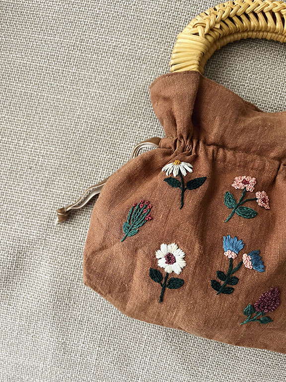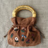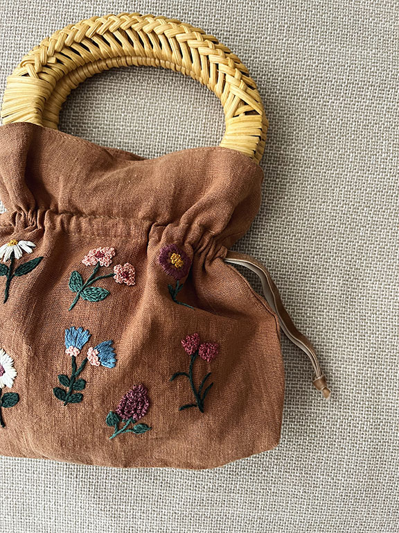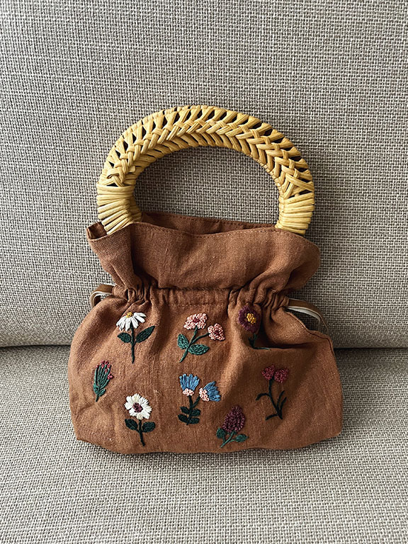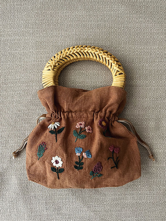 Lino 100% natural. Las asas ovaladas, de madera y mimbre. Bordado a mano y confeccionado de forma artesanal en un taller de Madrid.