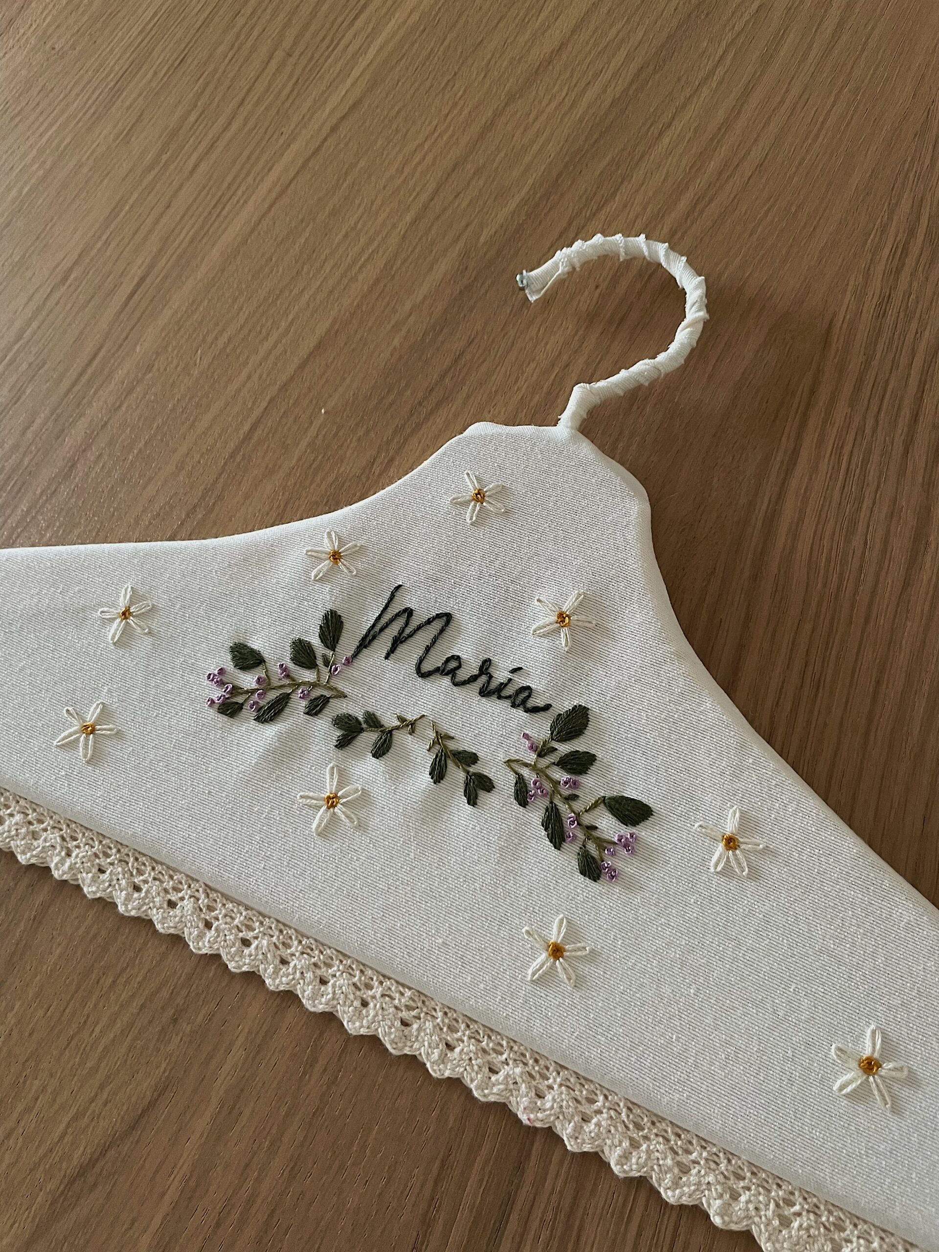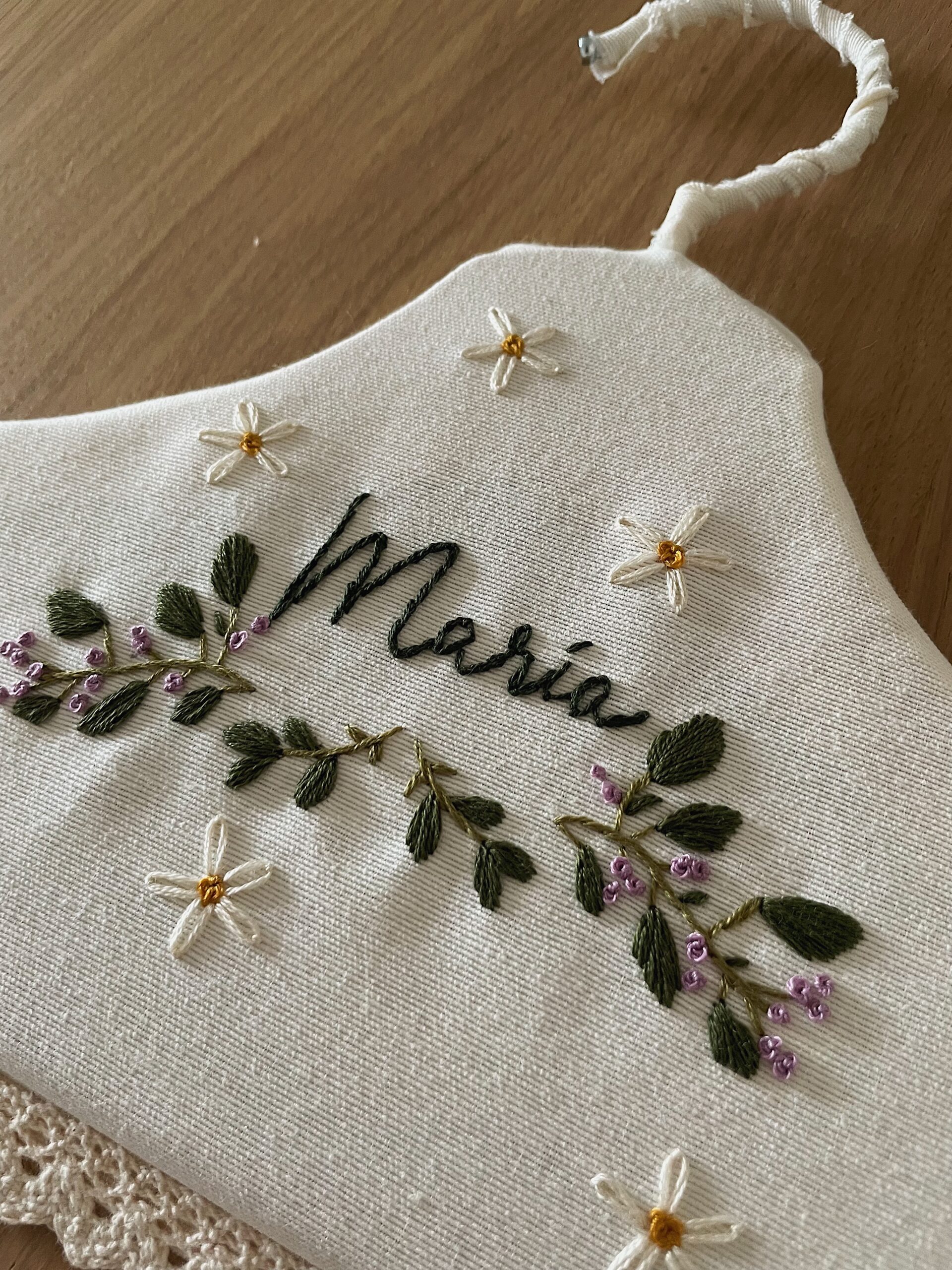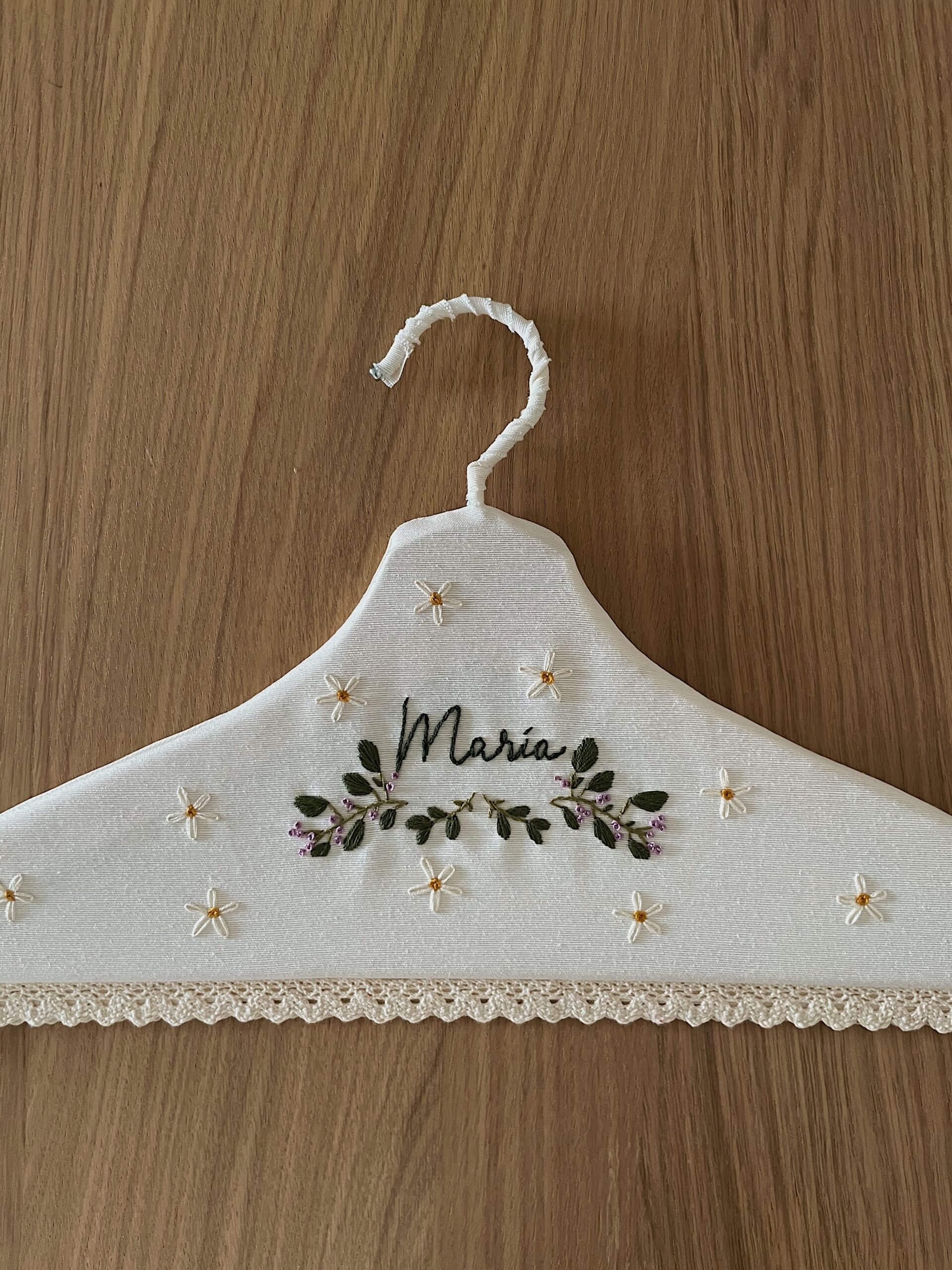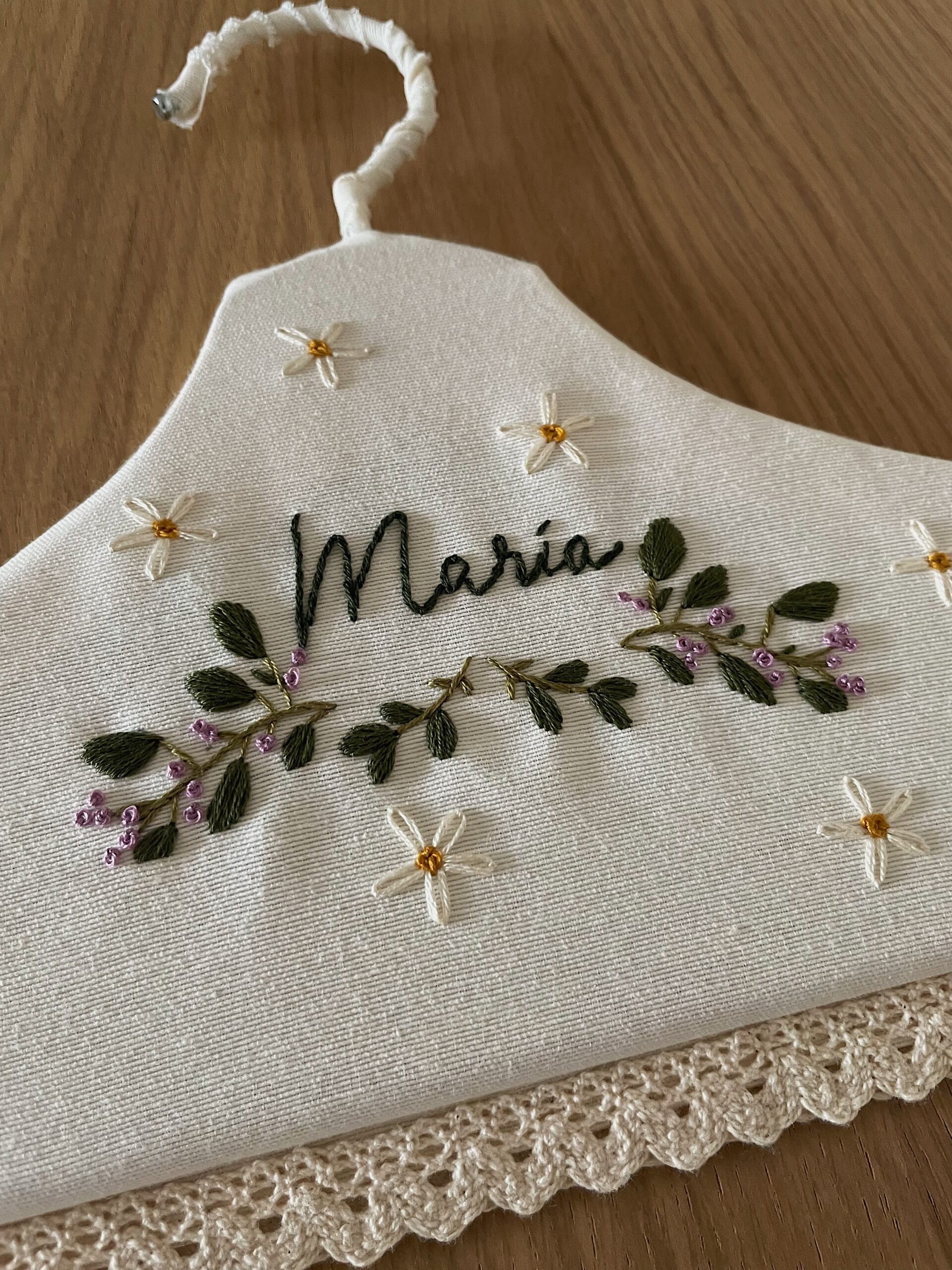 Bordado a mano y personalizado con el nombre de la novia, madrina o quien tú quieras. La percha va rematada con un ribete de algodón.